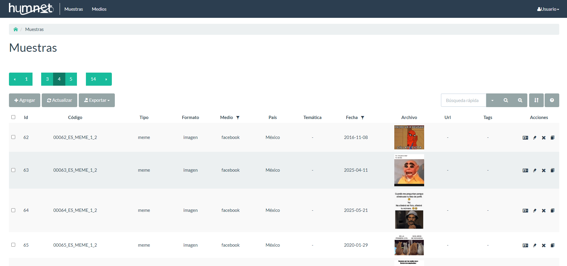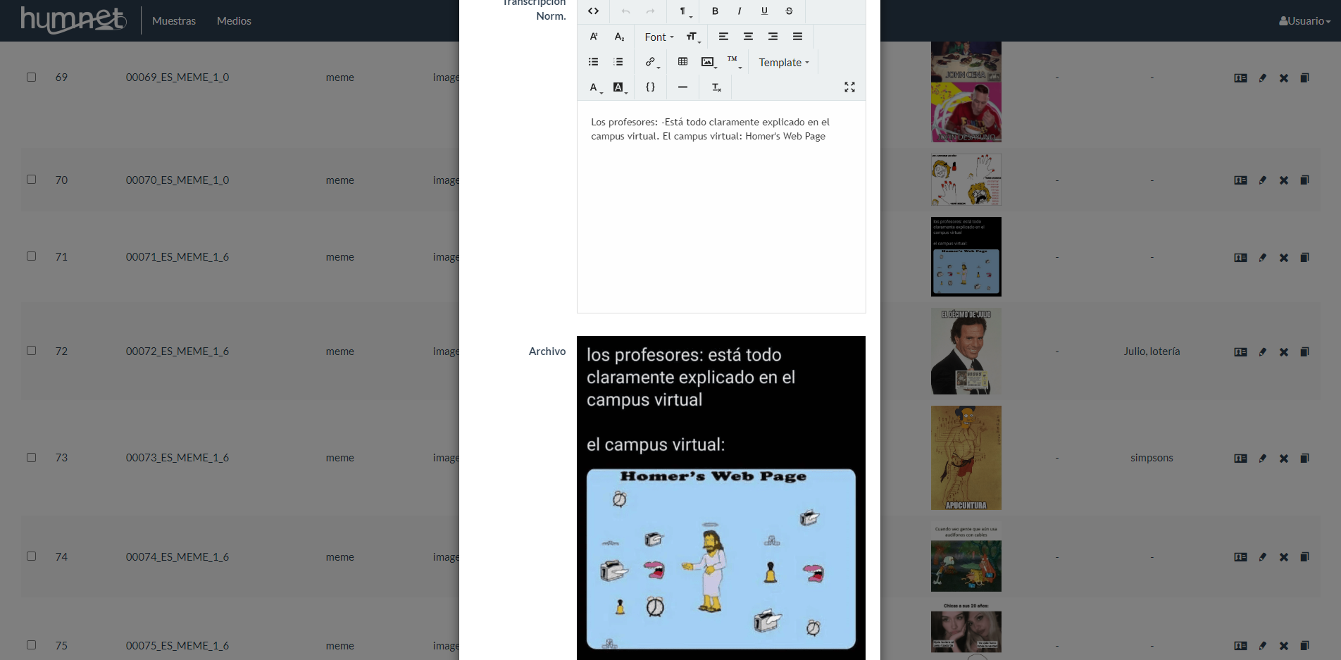 Captura de la edición de muestras de Humnet